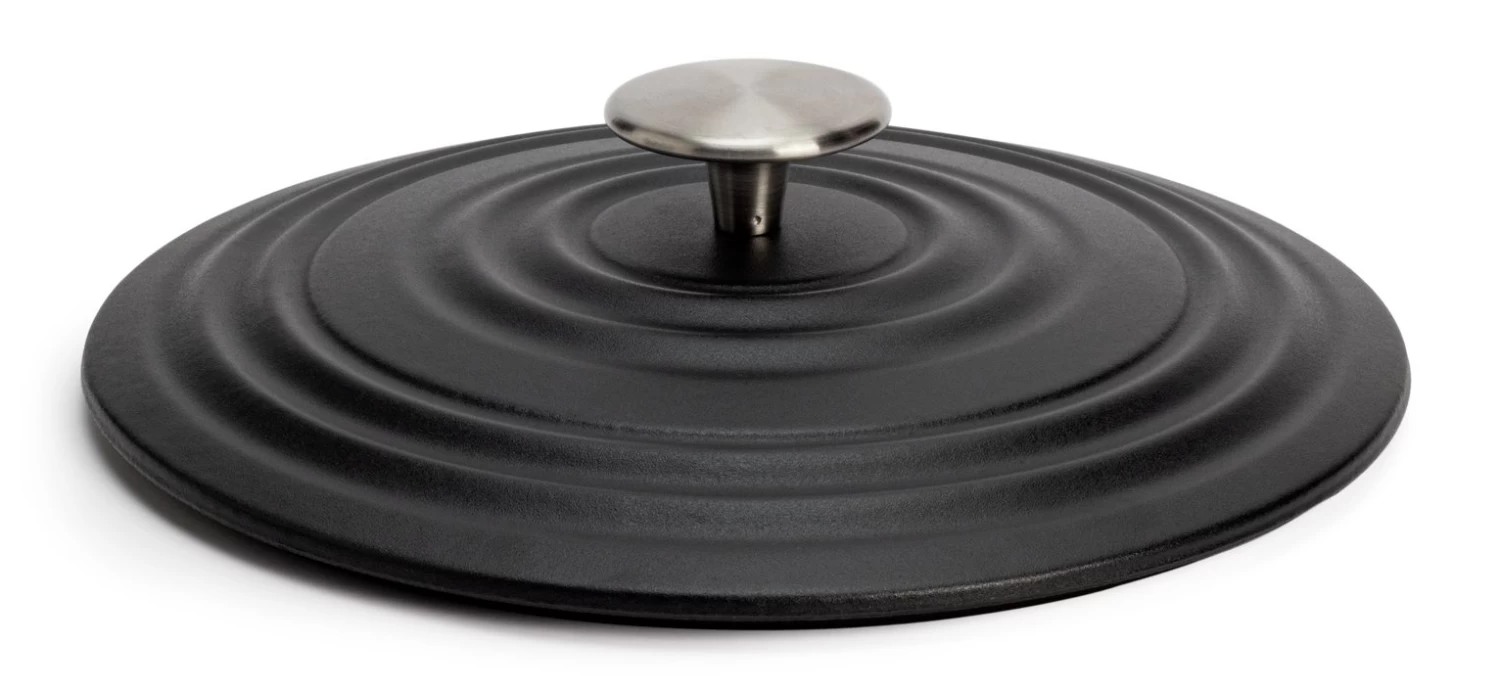 Cook and serve in style. Feast your eyes on our bold black cast iron casserole dish. With its ripple effect and silver knob, it's handsome enough to take straight from the oven to the table. And being cast iron it cooks evenly and retains heat for longer. So goodbye burnt bits and hello hot meals. It has an enamel coating which makes it easier to clean, too. What a dish.