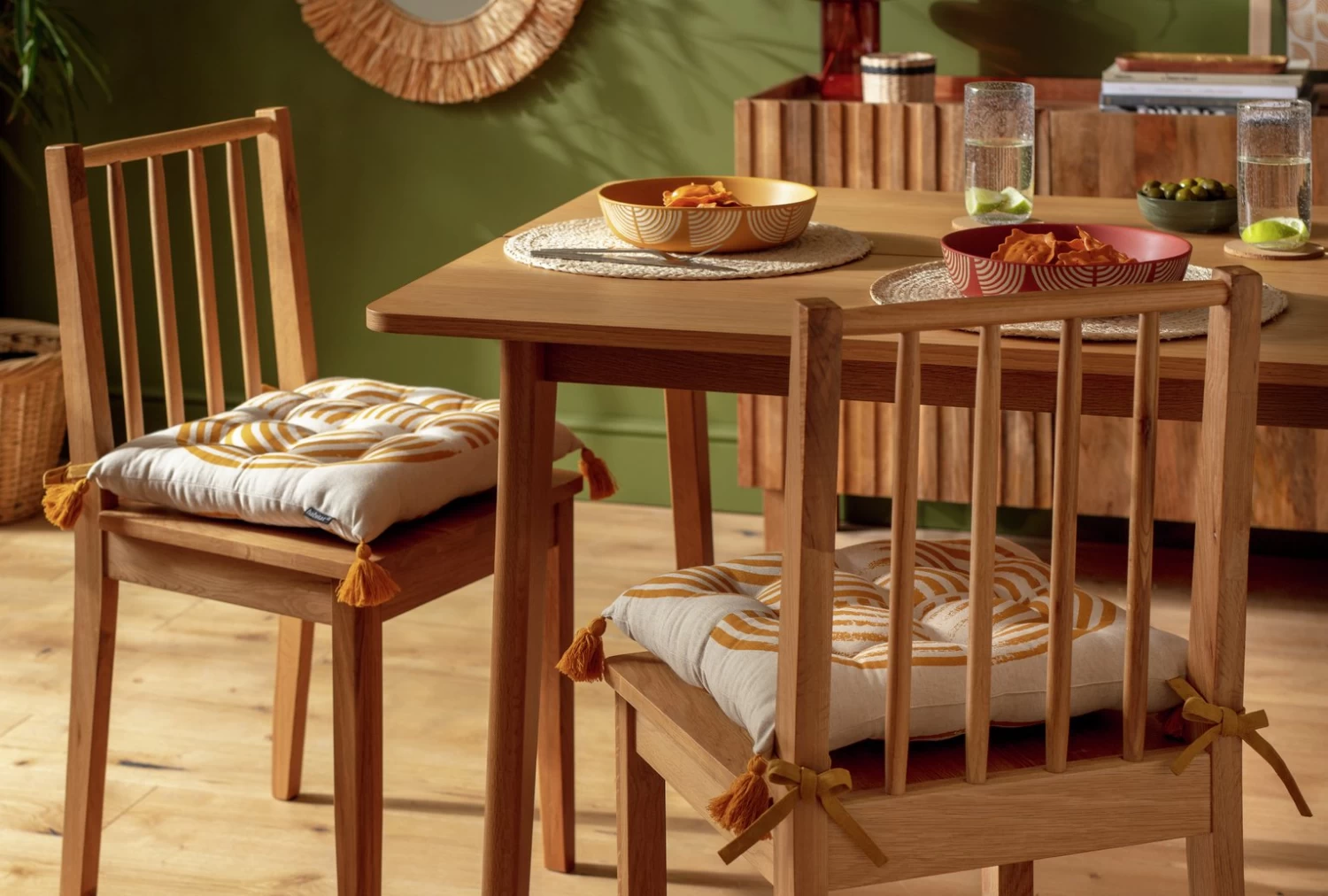 Designed exclusively in-house, this pair of orange and cream patterned seat pads are a smart way to add instant comfort and pizazz to a chair. Plumply stuffed with recycled wadding, each cushion is stylishly tucked and features orange corner tassels and orange ties.