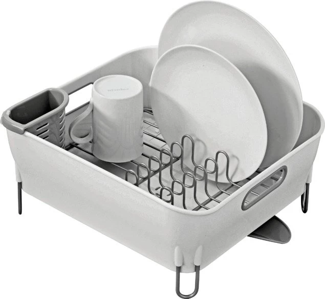 This simplehuman white compact dish rack is ideal for smaller kitchens with limited space. Keep it on your worktop and the moveable spout will drain the water, or save time and space by placing it in the sink. It is rustproof, dishwasher safe, and includes a utensil holder to ensure your cutlery dries quickly and efficiently.